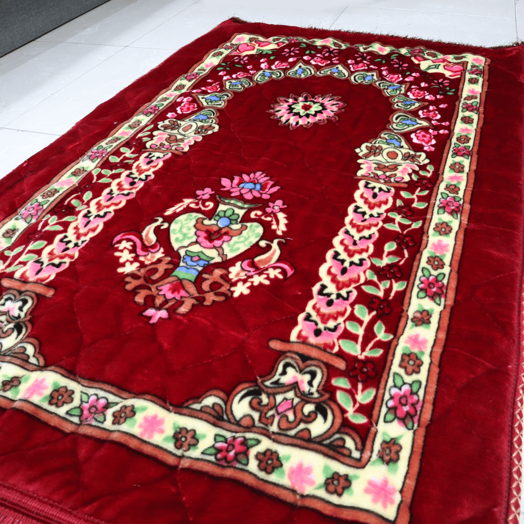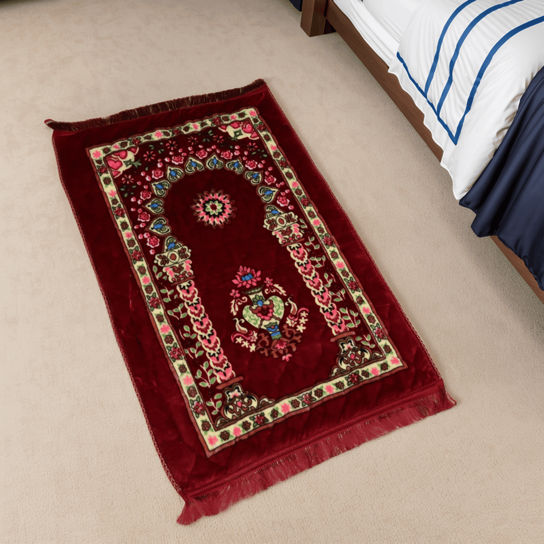 Experience the blessings and elegance with our exquisitely designed prayer mat. The intricate and beautifully printed pattern adds a touch of royalty and sophistication to your prayer space.