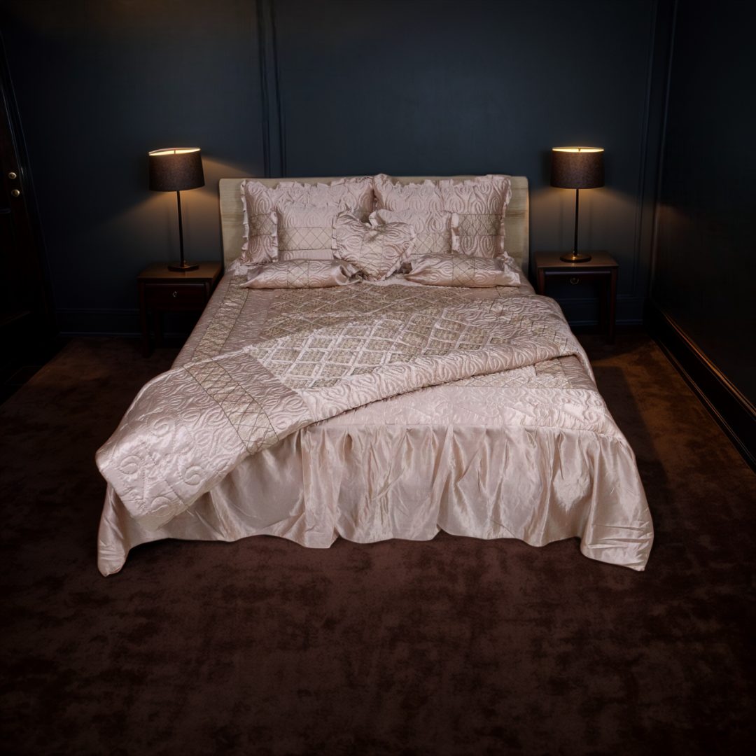 Rediscover the allure of your living space with our modern and luxurious Silk Collection, meticulously crafted to elevate your home interior to new heights of sophistication. Indulge in the epitome of elegance and finesse as our gorgeously designed quilted-looking bed set graces your room, adding a touch of opulence and charm. Immerse yourself in unparalleled comfort while enveloped in the soft embrace of our Silk Collection. Perfect for those seeking a bridal bed set that exudes both contemporary style and timeless luxury.