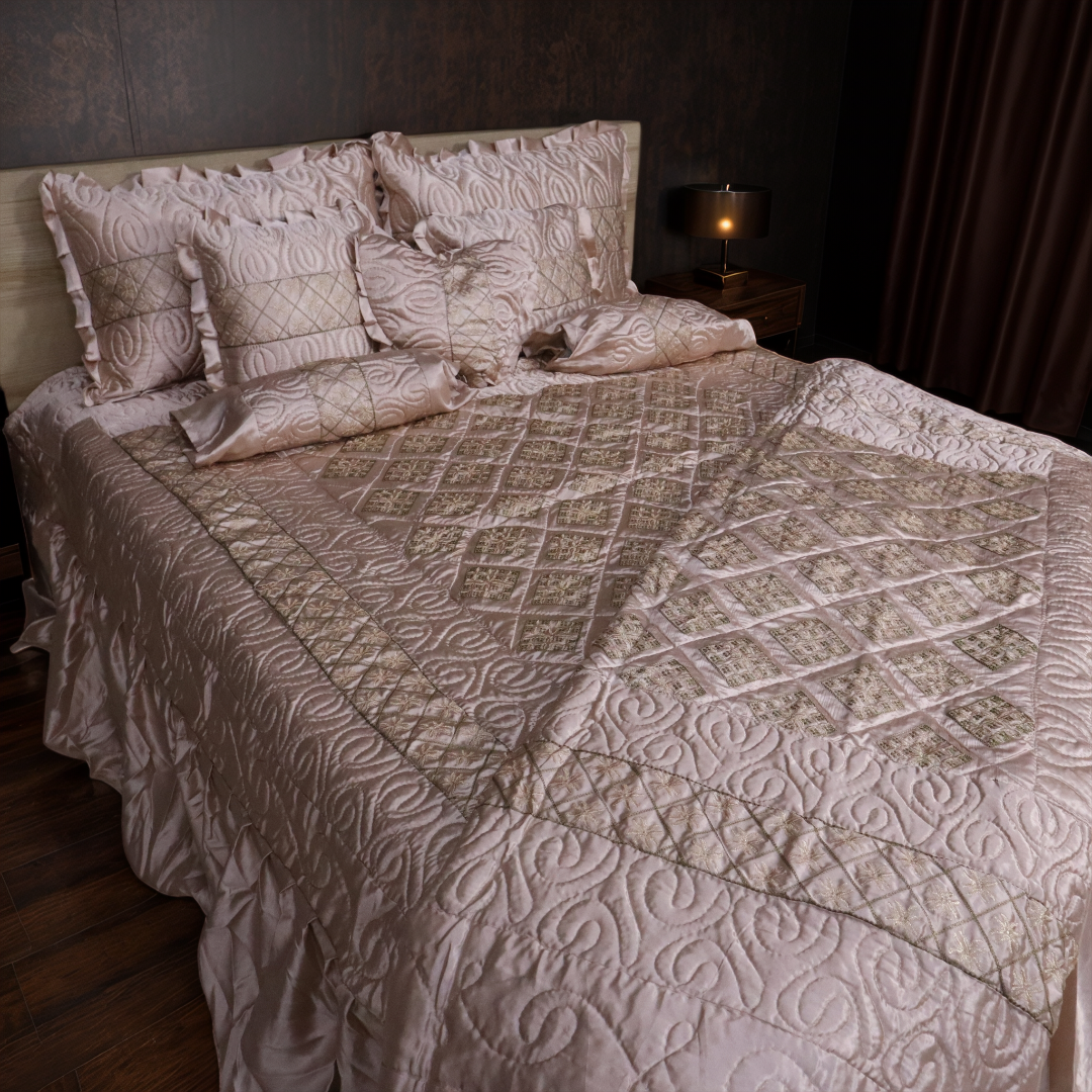 A quilted Bedsheet, Embroidered Comforter, 2 pillow covers, 2 cushions, 2 bolster cushions & 1 heart pillow.