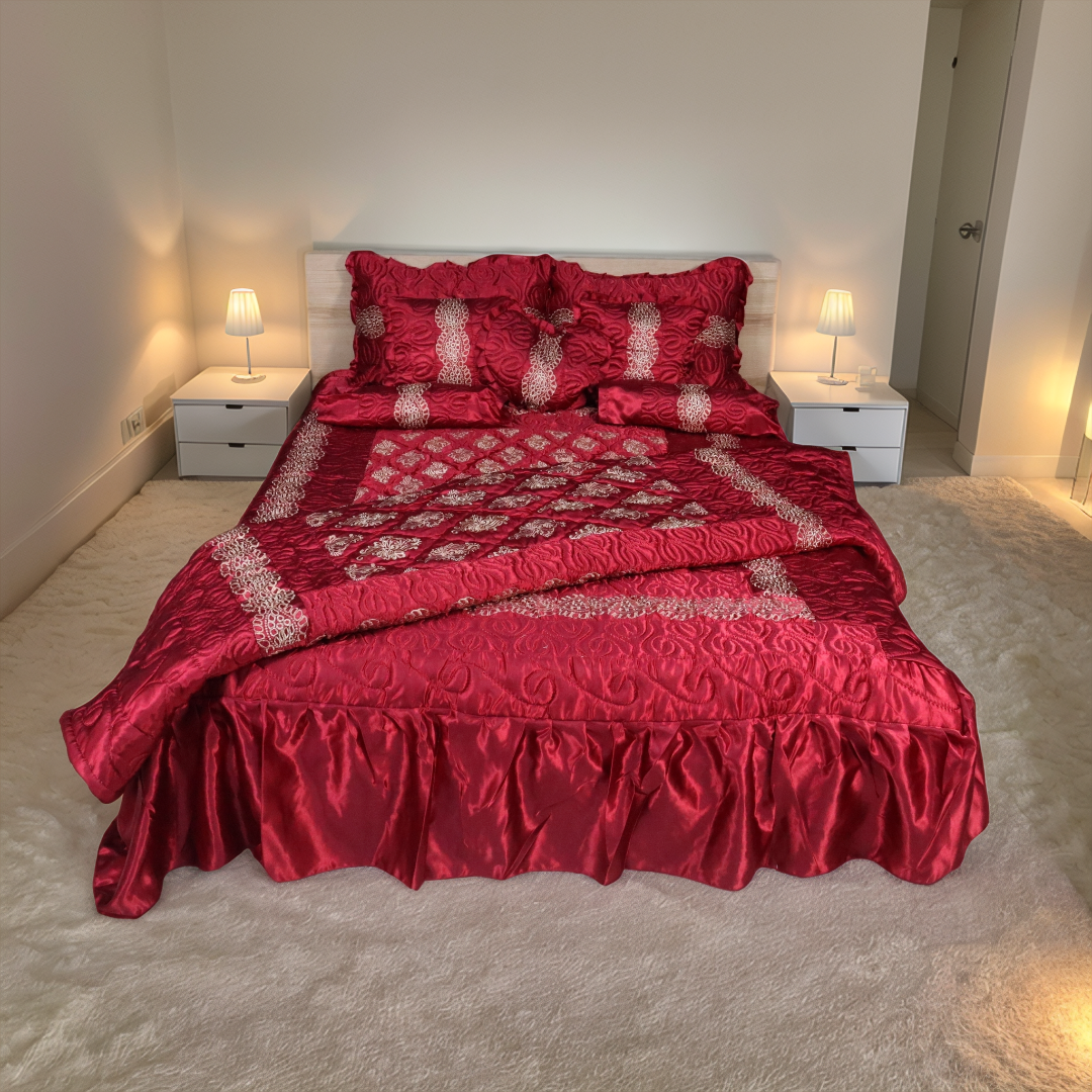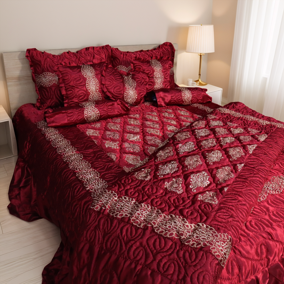 A quilted Bedsheet, Embroidered Comforter, 2 pillow covers, 2 cushions, 2 bolster cushions & 1 heart pillow.