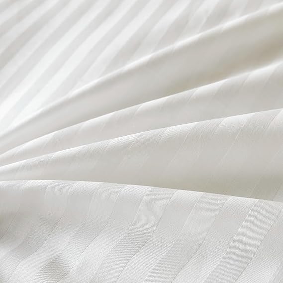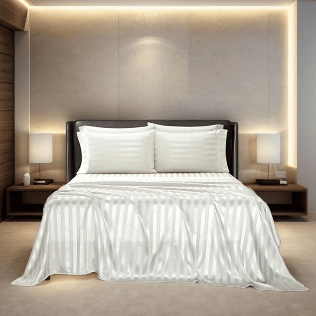 Elevate your sleep experience with our White Satin Stripe King-Size Bedsheet, crafted for ultimate comfort and style. Made from high-quality satin, this bedsheet offers a silky smooth texture that pampers your skin and hair as you rest. The satin stripe design adds a touch of elegance, making it perfect for any modern bedroom.